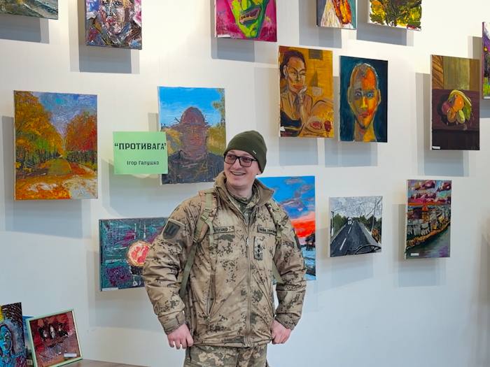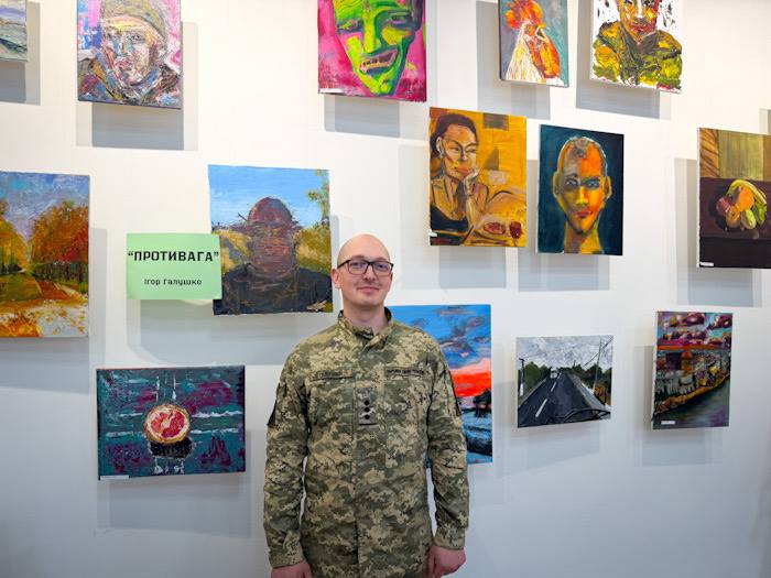 Автор виставки «Противага» Ігор Галушко розповів, що працює олією та акрилом, постійно експериментує з техніками й шукає власну художню мову, яка допомагає передати пережите. Частина робіт з’явилася після складних періодів служби.