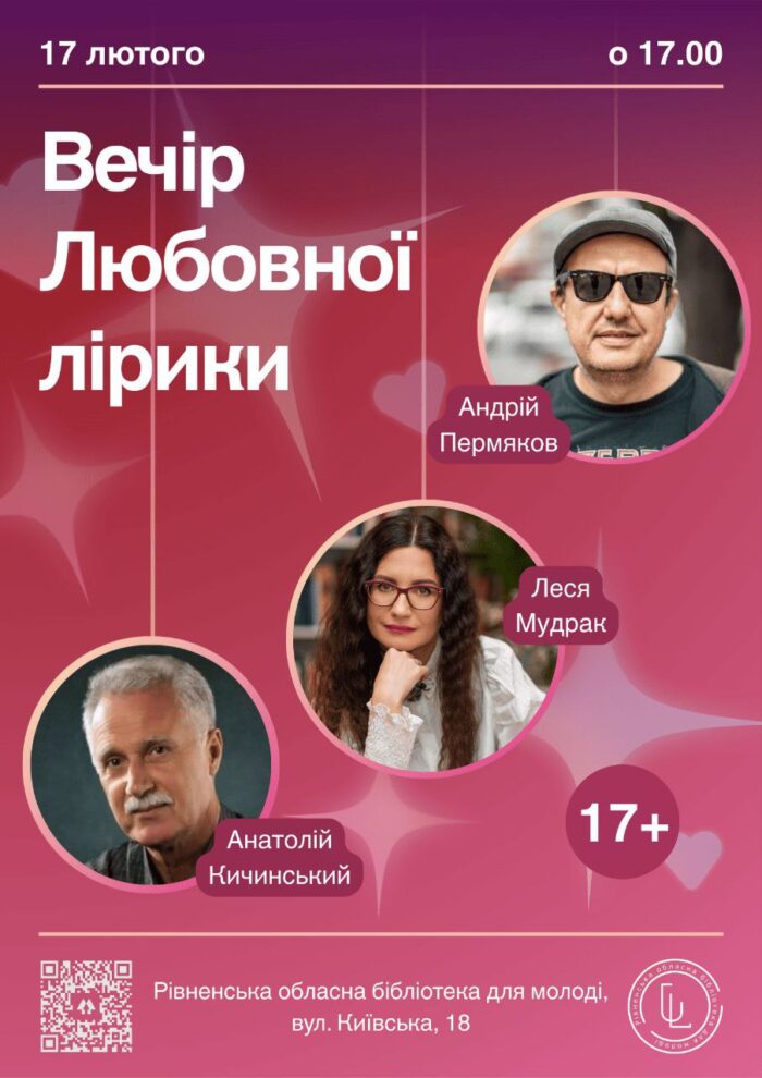 17 лютого о 17:00 у Рівненській обласній бібліотеці для молоді відбудеться Вечір любовної лірики. Перед рівнянами виступлять українські автори Анатолій Кичинський, Леся Мудрак та Андрій Пермяков.