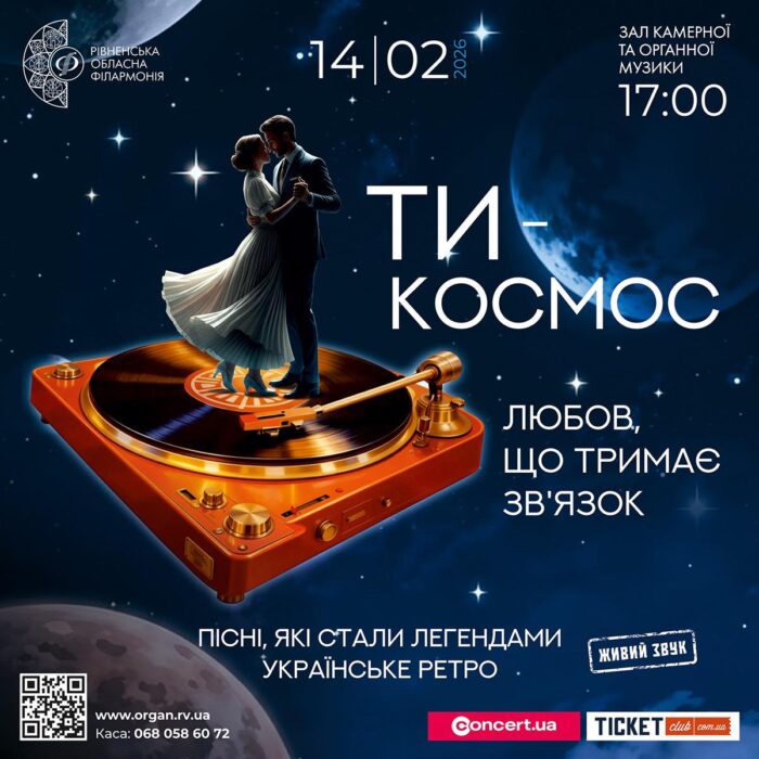 14 лютого о 17:00 Рівненська обласна філармонія представить концертну програму «ТИ – КОСМОС. Любов, що тримає зв’язок». На сцені виступлять солісти та ансамблі філармонії.