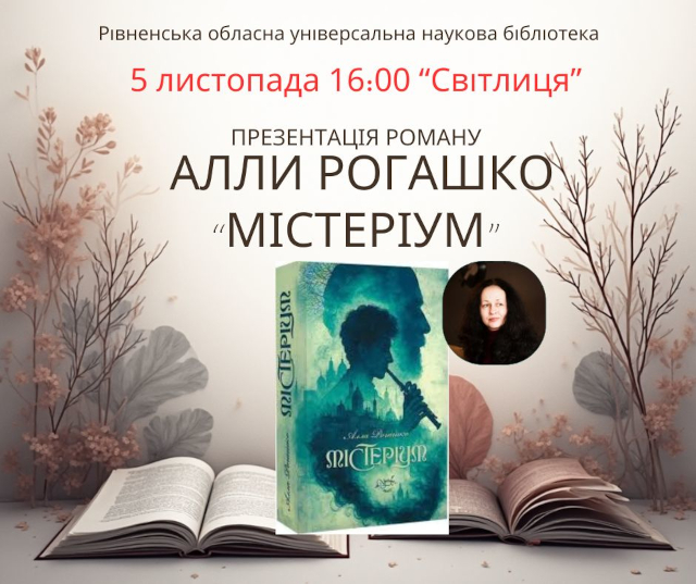 Під час зустрічі учасники зможуть зазирнути у містичне закулісся роману, дізнатися, які історичні постаті та локації Рівненщини стали частиною сюжету, а також з’ясувати, чому саме «Містеріум» виявився для Алли Рогашко її романом, який писався найдовше.