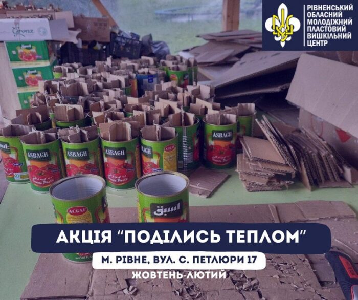 Рівненський обласний молодіжний пластовий вишкільний центр розпочав ініціативу “Поділись теплом” — акцію, під час якої волонтери виготовлятимуть окопні свічки для військових на передовій. Мета — допомогти бійцям зігрітися у холодну пору року.