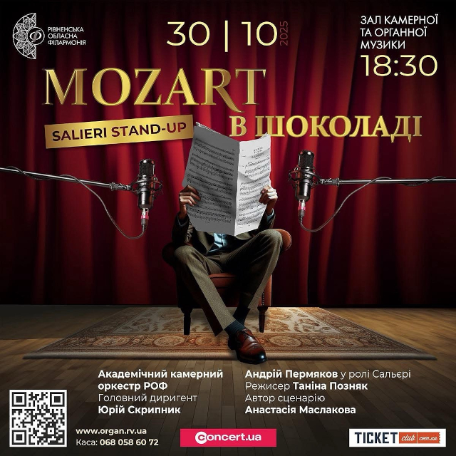 Наприкінці жовтня рівнян очікує цікава мистецька подія – SALIERI STAND-UP “Моцарт у шоколаді”. У рамках цього дійства, Антоніо Сальєрі повертається, щоб поставити усі крапки над “і”.