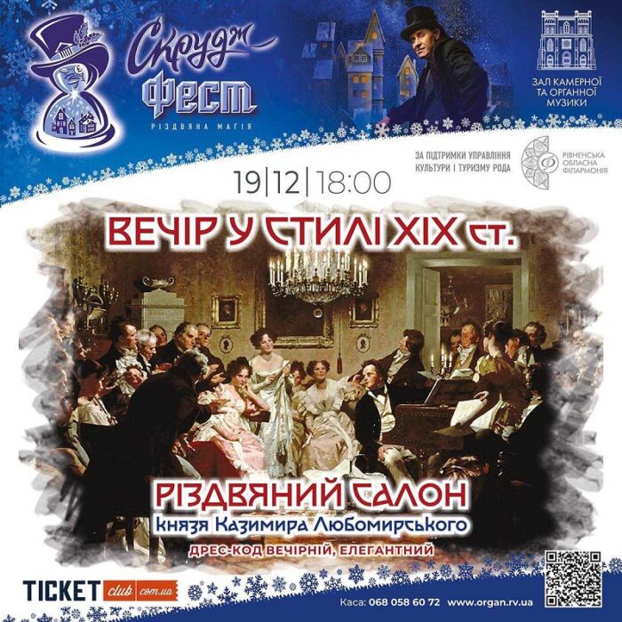 Захід відбудеться у Залі камерної та органної музики. Він цього вечора перевтілиться на аристократичний салон із живою музикою, неспішними розмовами й атмосферою шляхетного дому. Подія проходить у межах ІІ Міжнародного фестивалю «Скрудж фест», який нині триває у Рівному.