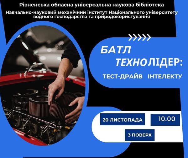 Рівнян запрошують взяти участь у науково-технічному випробуванні «Технолідер», яке відбудеться 20 листопада о 10:00 на 3 поверсі Рівненської обласної універсальної наукової бібліотеки.
