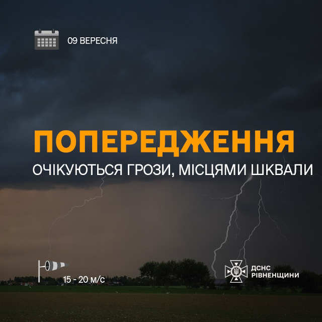 Як повідомляє Рівненський обласний центру з гідрометеорології сьогодні, 9 вересня, очікуються грози, місцями шквали 15-20м/с.