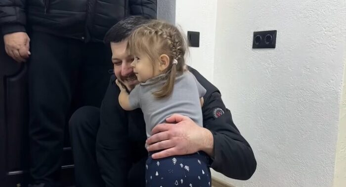 Стрілбатівець підготувався до зустрічі – придбав букети для дружини й доньки та іграшкового зайчика для Анютки. Коли двері оселі відчинилися, дівчинка не стримала радості: стрибала, плескала в долоні та вигукнула «тато». За мить вона міцно обійняла батька своїми маленькими руками.