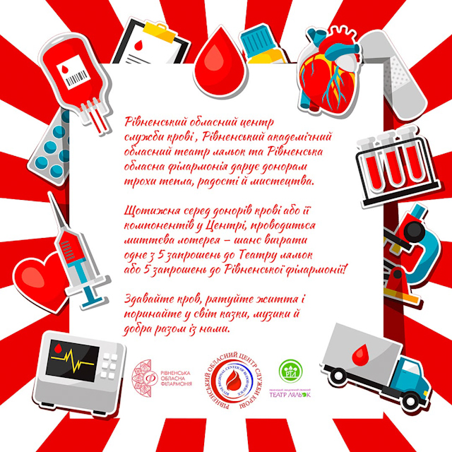 Донори, які найближчим часом здаватимуть кров у Рівненському обласному центрі служби крові, автоматично стануть учасниками лотерейного розіграшу, що дає їм шанс виграти квитки до провідних культурних закладів міста — театру ляльок, обласної філармонії та драмтеатру. Це не лише можливість підтримати донорство, а й чудовий спосіб відвідати цікаві події та насолодитися культурними заходами.