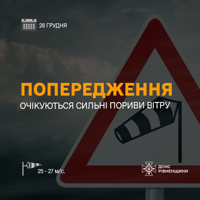Завтра, 28 грудня, за інформацією Рівненського обласного центру з гідрометеорології по Рівненській області та Рівному протягом доби очікуються сильні пориви північно-західного вітру 25–27 м/с.