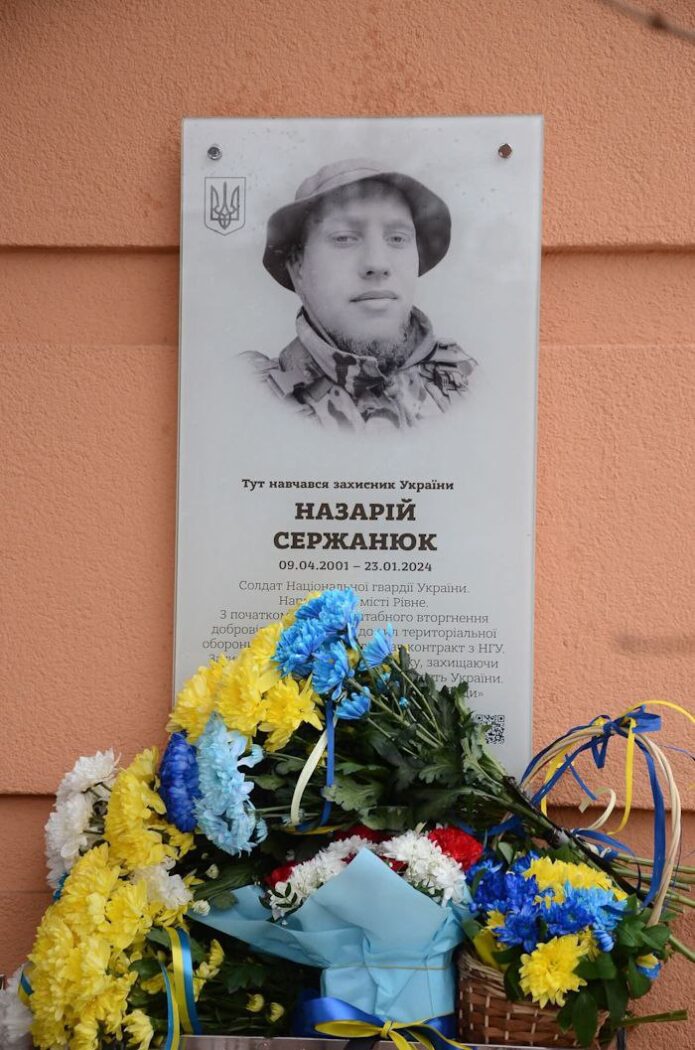 Сьогодні на фасаді ліцею №12 у Рівному відкрили меморіальну дошку загиблому Захиснику України — Назарію Сержанюку. Пам’ятний знак встановили на будівлі закладу освіти, де минули його шкільні роки.