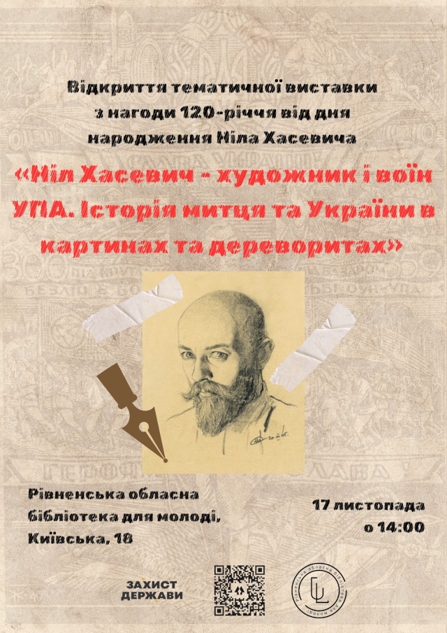 Рівненська обласна бібліотека для молоді запрошує відвідати тематичну виставку, присвячену 120-річчю від дня народження видатного українського художника, графіка, воїна УПА та борця за незалежність України — Ніла Хасевича.