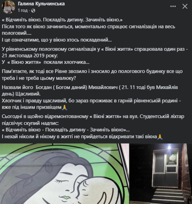 Сьогодні в щойно відремонтованому «Вікні життя» на вул. Студентській ліхтар підсвічує скупий надпис: «Відчиніть вікно – Покладіть дитину – Зачиніть вікно»… І нехай ніколи й нікому в житті не доведеться відкривати такі вікна.