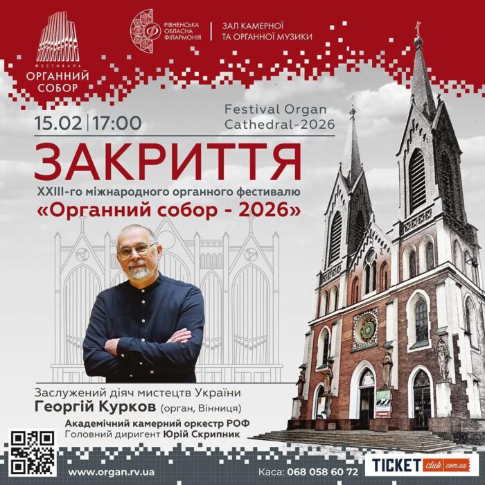 У Рівненській обласній філармонії 15 лютого о 17:00 відбудеться фінальний концерт XXIII Міжнародного органного фестивалю «Органний собор – 2026».
