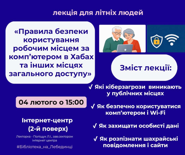 У межах тижня кібербезпеки в Інтернет-центрі організовують лекцію «Правила безпеки користування робочим місцем за комп’ютером у хабах та інших місцях загального доступу».