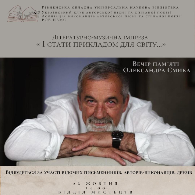 О 14.00 відбудеться літературно-музична імпреза «І стати прикладом для світу…». Вечір пам’яті Олександра Смика – митця, барда, поета, людини, яка жила піснею і словом пройде у відділі мистецтв Рівненської обласної універсально наукової бібліотеки, що на вулиці Олександра Борисенка, 6.
