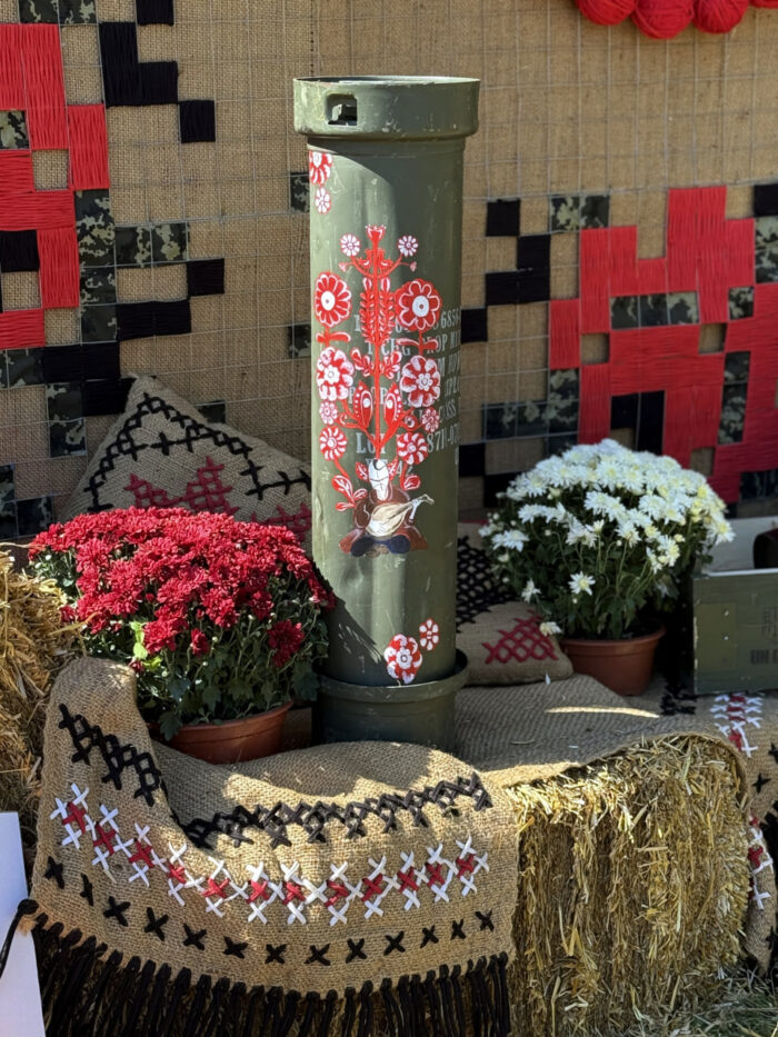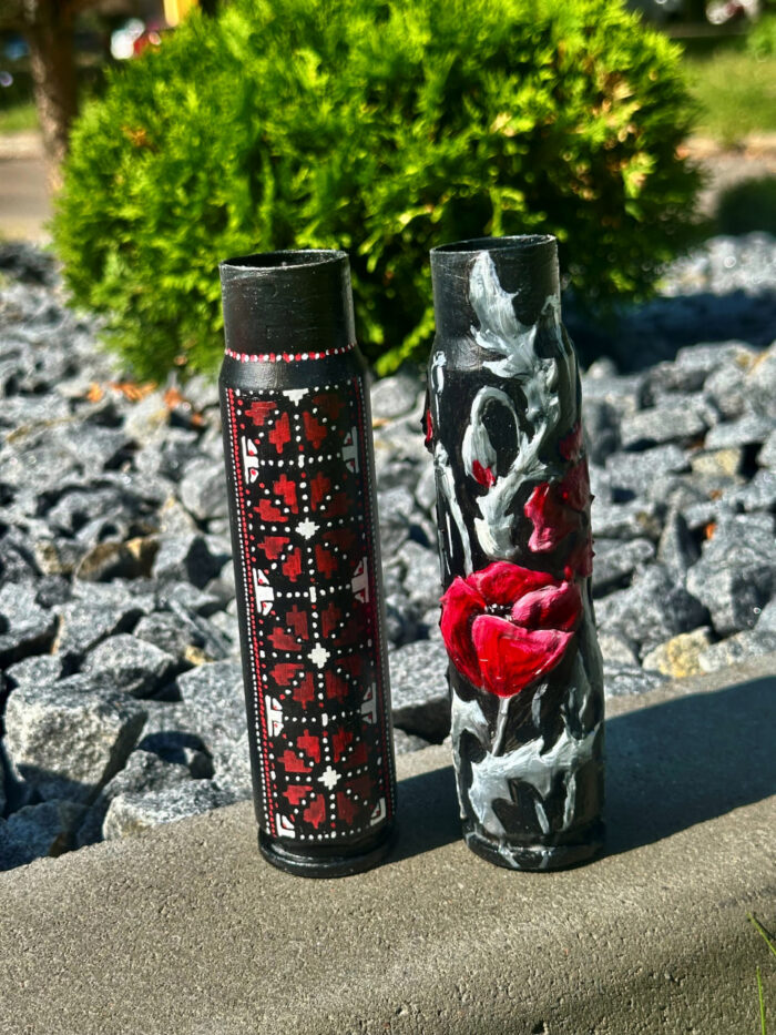 - Гільзи розписані традиційним орнаментом та маками, автор Людмила Веремійчук, до речі, саме цими 23 мм патронами збиваються шахеди зенітними кулеметами мобільних вогневих груп;
